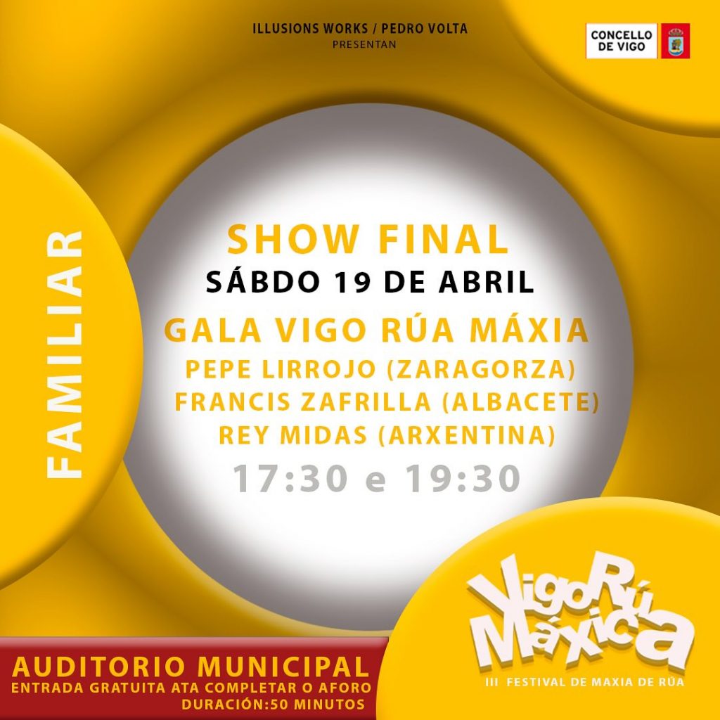 Si amig@s, esta semana santa, me voy a Vigo a participar en unas actuaciones dentro de la programación del III Festival de magia de calle de Vigo, me encanta hacer magia de calle. Aunque por la previsión del tiempo, al final se ha quedado en un show de magia de calle indoor ( tengo un deja-vu del año pasado en Torino en el campeonato europeo de magia de calle que también acabamos haciendo magia indoor). Pues eso, que voy para Vigo para hacer nuev@s amig@s, nuevas magias, nuevos juegos y muchas risas.